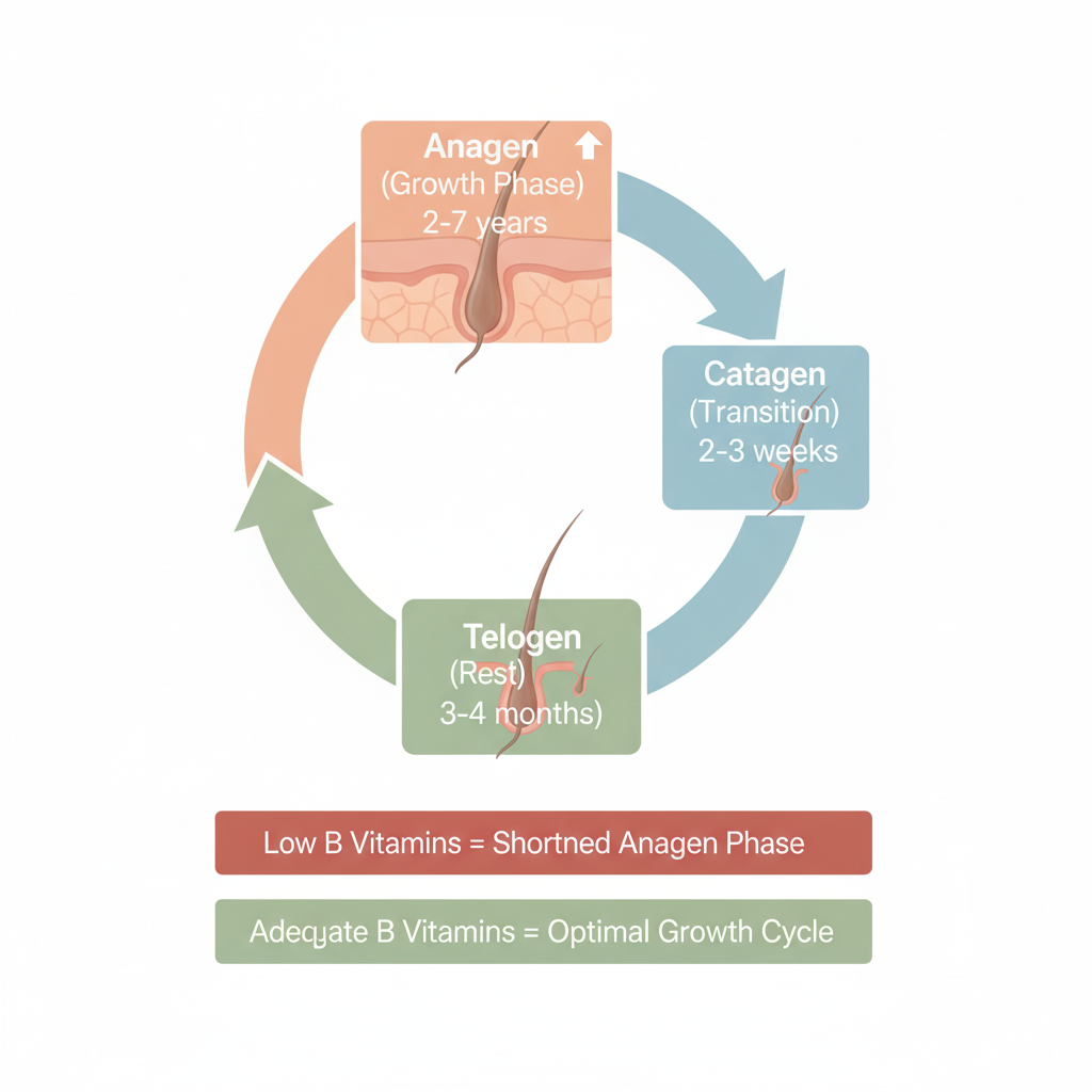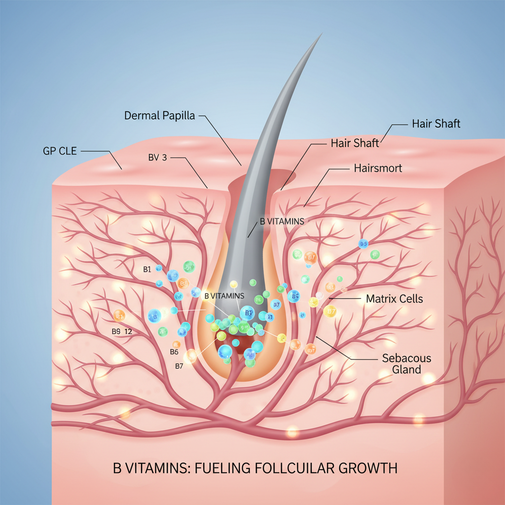 B vitamins play key roles in hair health. B7 (Biotin) is a cofactor for enzymes involved in keratin synthesis, B9 (Folate) is essential for DNA synthesis during cell division in follicles, and B12 is required for red blood cell production that delivers oxygen to your scalp.