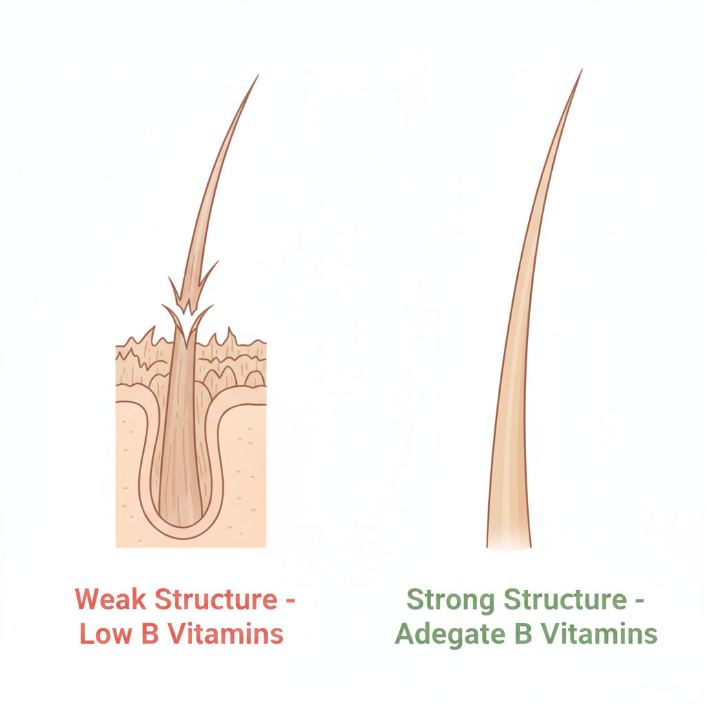 Hair follicles contain rapidly dividing cells that require continuous B vitamin supply. B9 (Folate) supports DNA synthesis during cell division, B12 aids in cellular metabolism, and the B-complex works together to support the growth cycle.